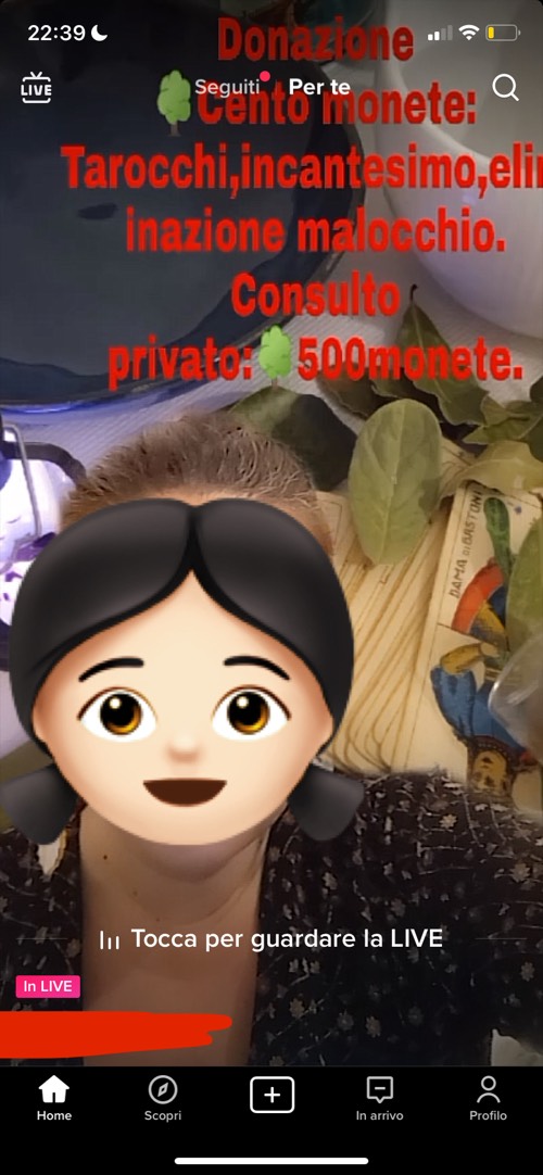 Ho visto live da 400 persone collegate contemporaneamente. C’era questa signora (vedi screenshot) che leggeva domande e rispondeva scartando carte da gioco napoletane, ovviamente solo dietro pagamento in coin di TikTok.